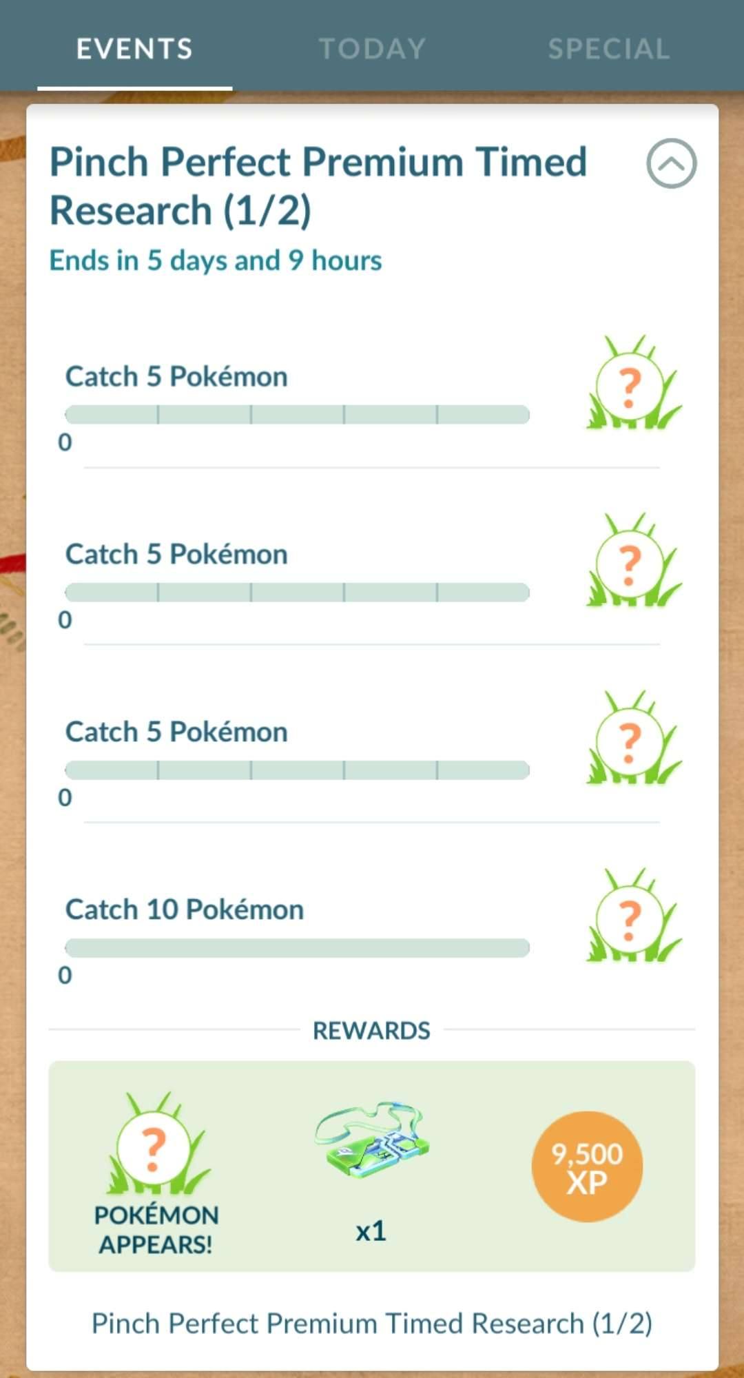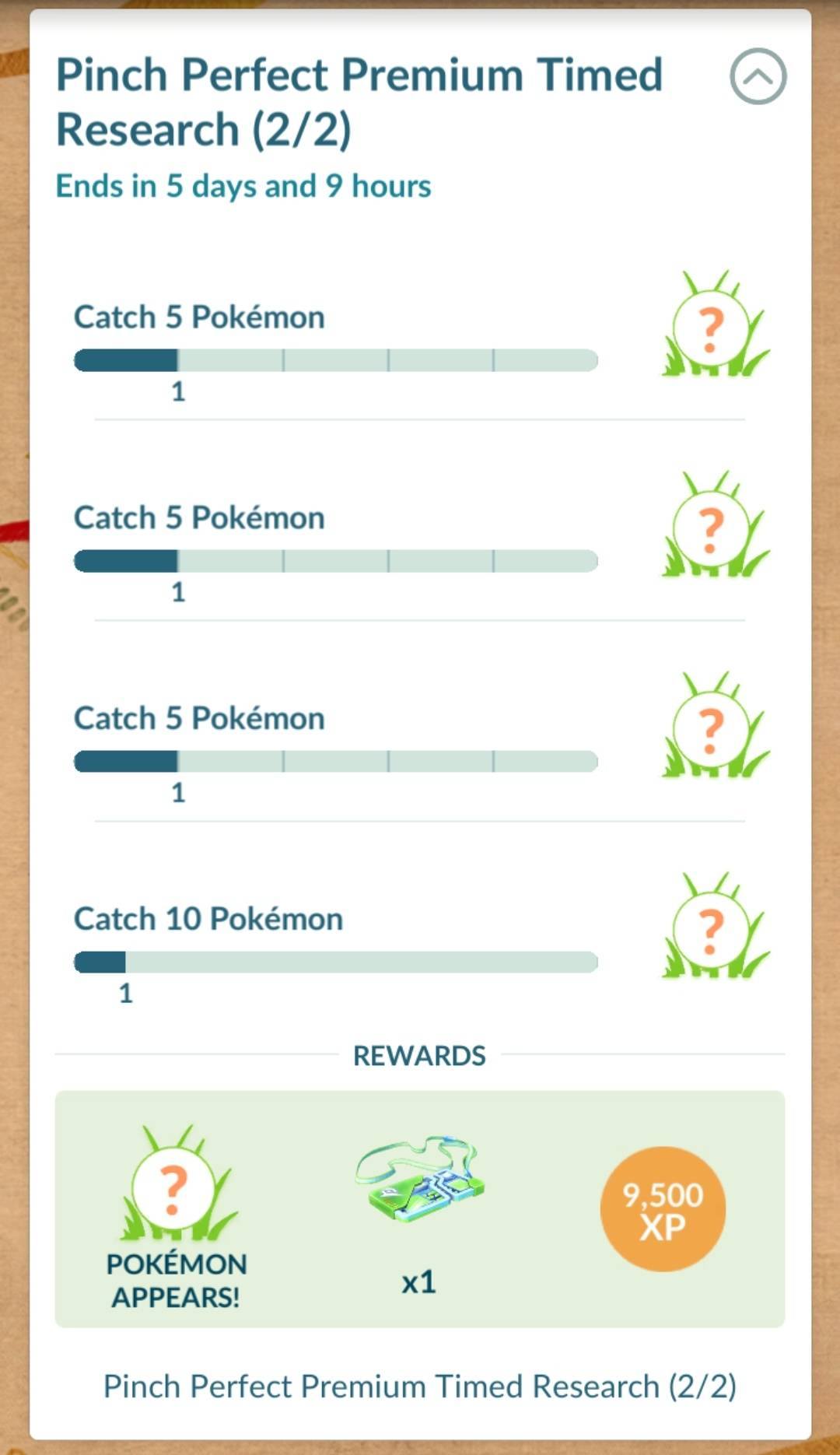 任務:捕捉 5 隻寶可夢 獎勵(隨機):精靈球 x10、超級球 x5、或是 高級球 x3