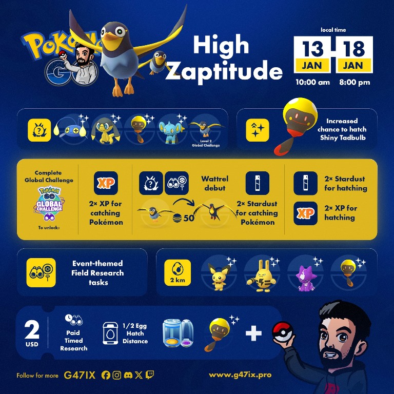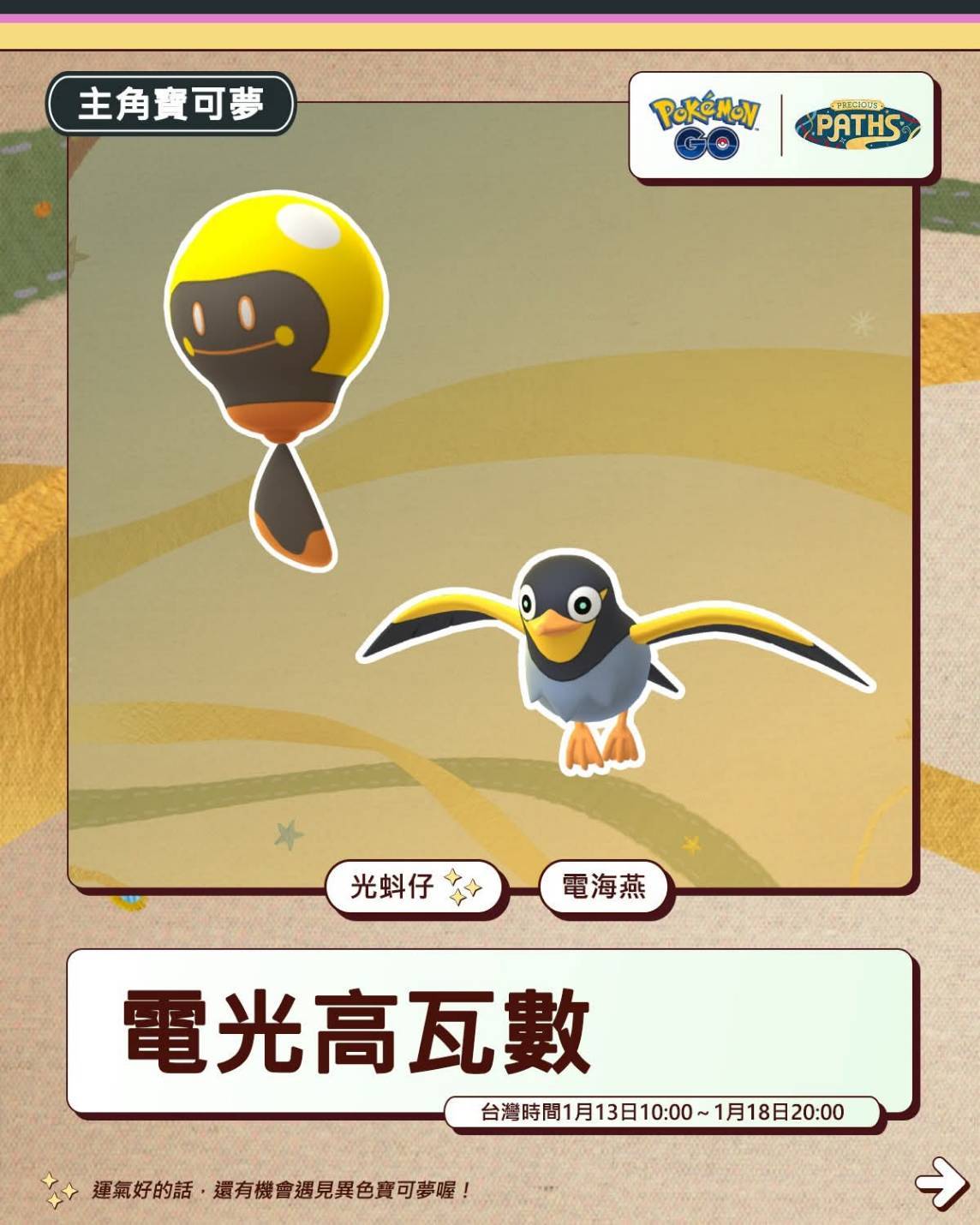 01/13 電光高瓦數活動、全球大挑戰任務獎勵、電海燕&大電海燕初登GO、田野調查課題、付費解鎖限時調查 Pokemon GO 2026