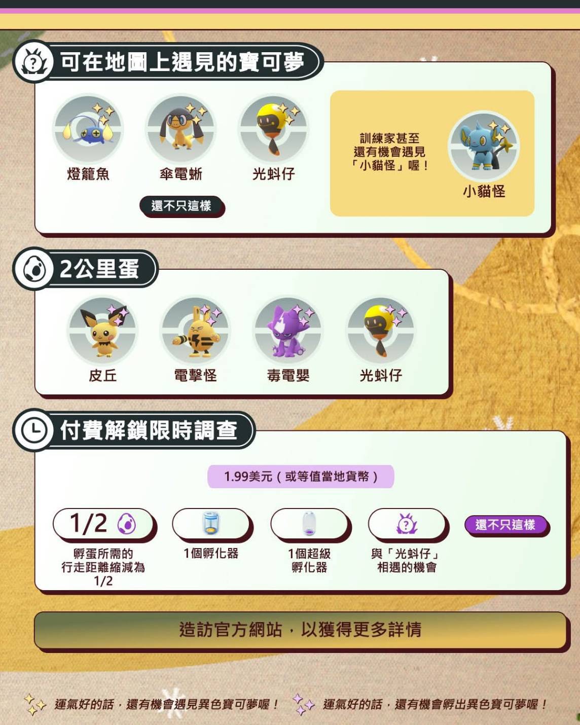 未來活動將有可能調整。請務必追蹤我們的社群媒體、設定接收推播通知,並且訂閱我們的電子郵件,以獲得最新資訊。—《Pokémon GO》開發團隊敬上