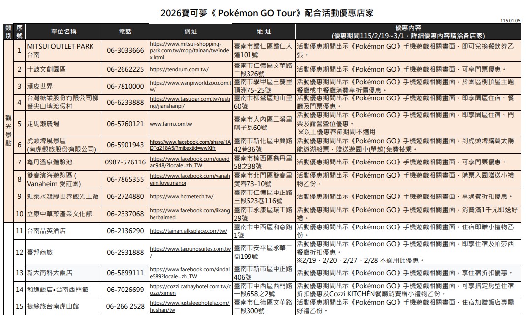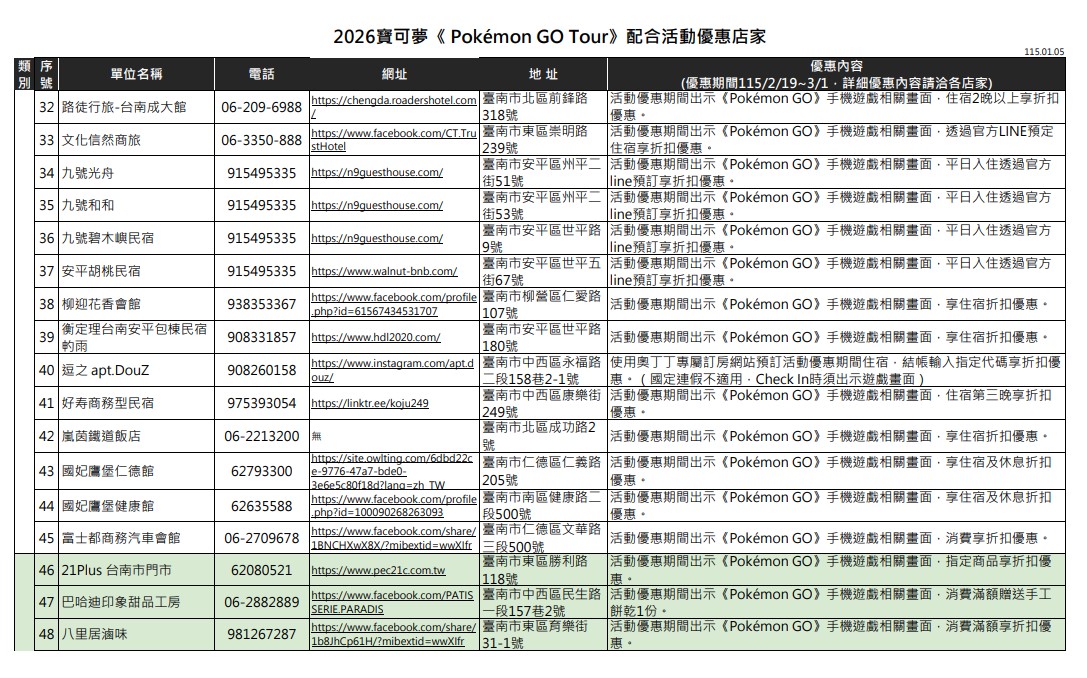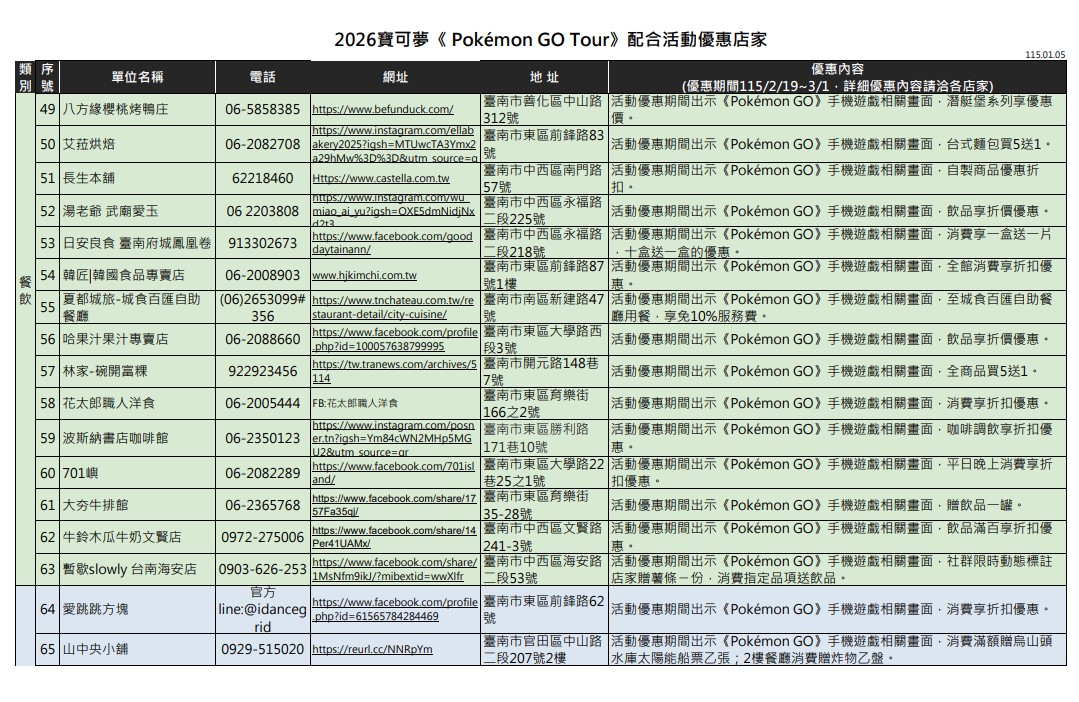 2026年寶可夢《Pokémon GO Tour》台南活動 的配合優惠店家列表。