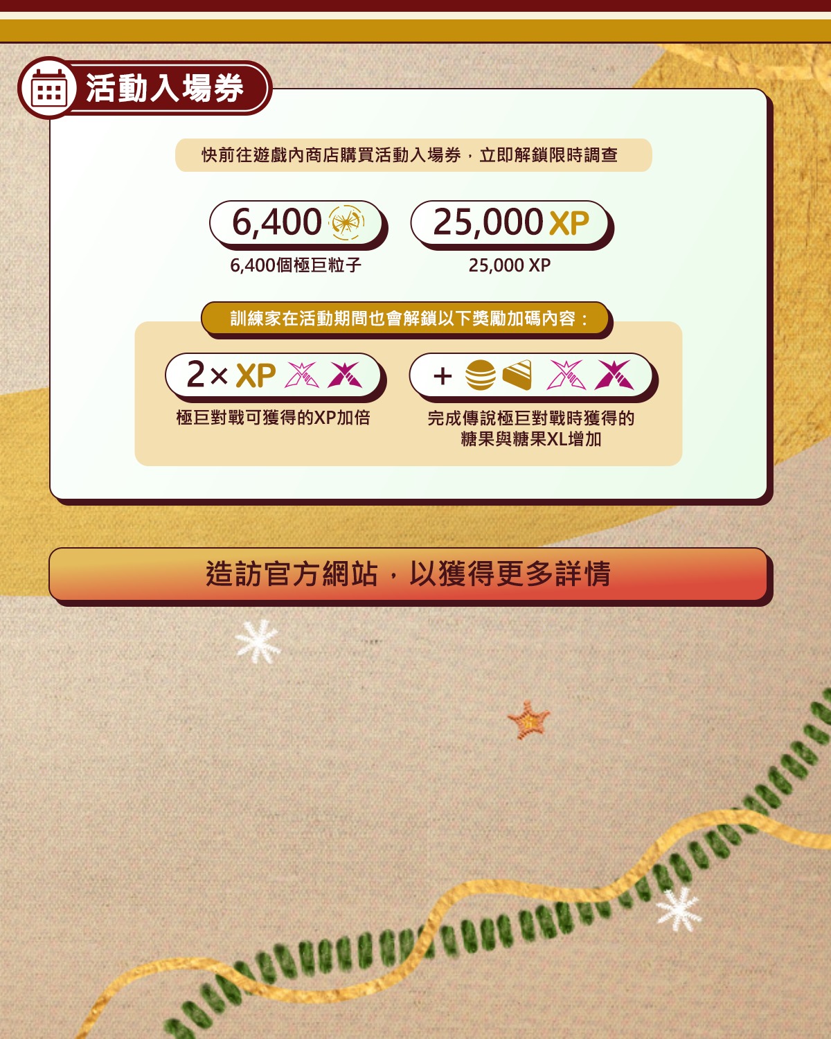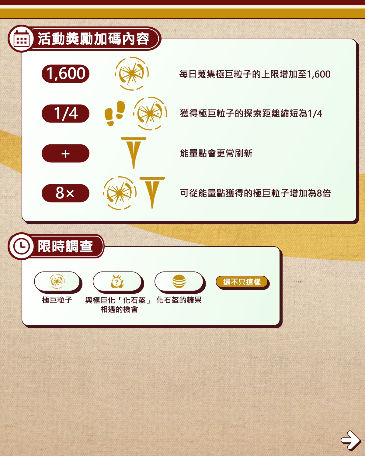 *訓練家必須先從「看看附近」選單領取可蒐集的極巨粒子,才能解鎖此獎勵加碼內容。