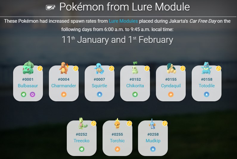 The following Pokémon will appear more frequently and will be attracted to Lure Modules: