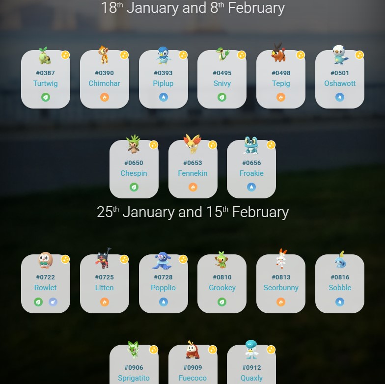 — 2026 年 1 月 25 日星期日: 木木梟、火斑喵、球球海獅 敲音猴、炎兔兒、淚眼蜥 新葉喵、呆火鱷、潤水鴨