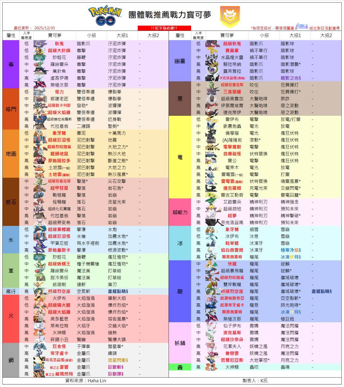 《Pokémon GO》團體戰推薦戰力寶可夢列表(最近更新:2025/12/30)。