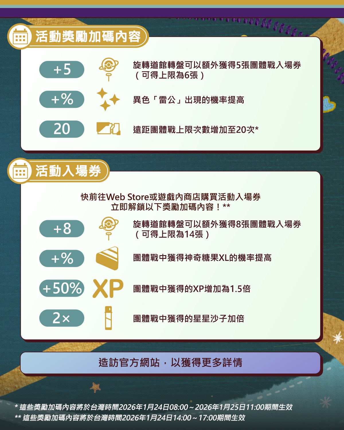 獎勵加碼內容將於台灣時間2026年1月24日14:00~17:00期間生效。