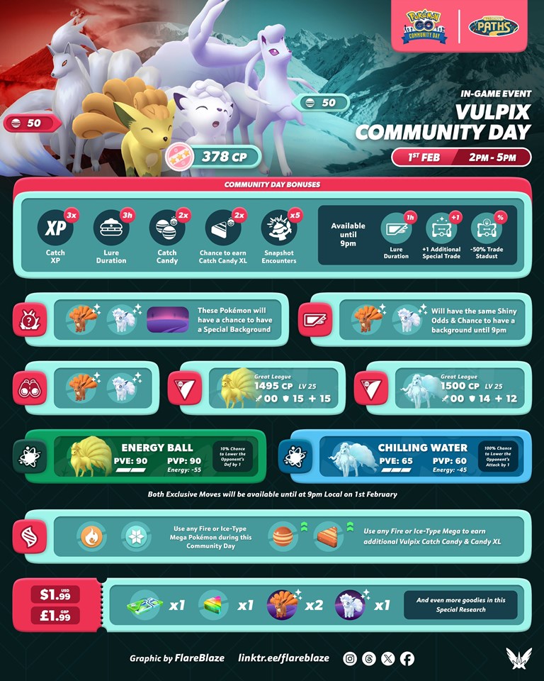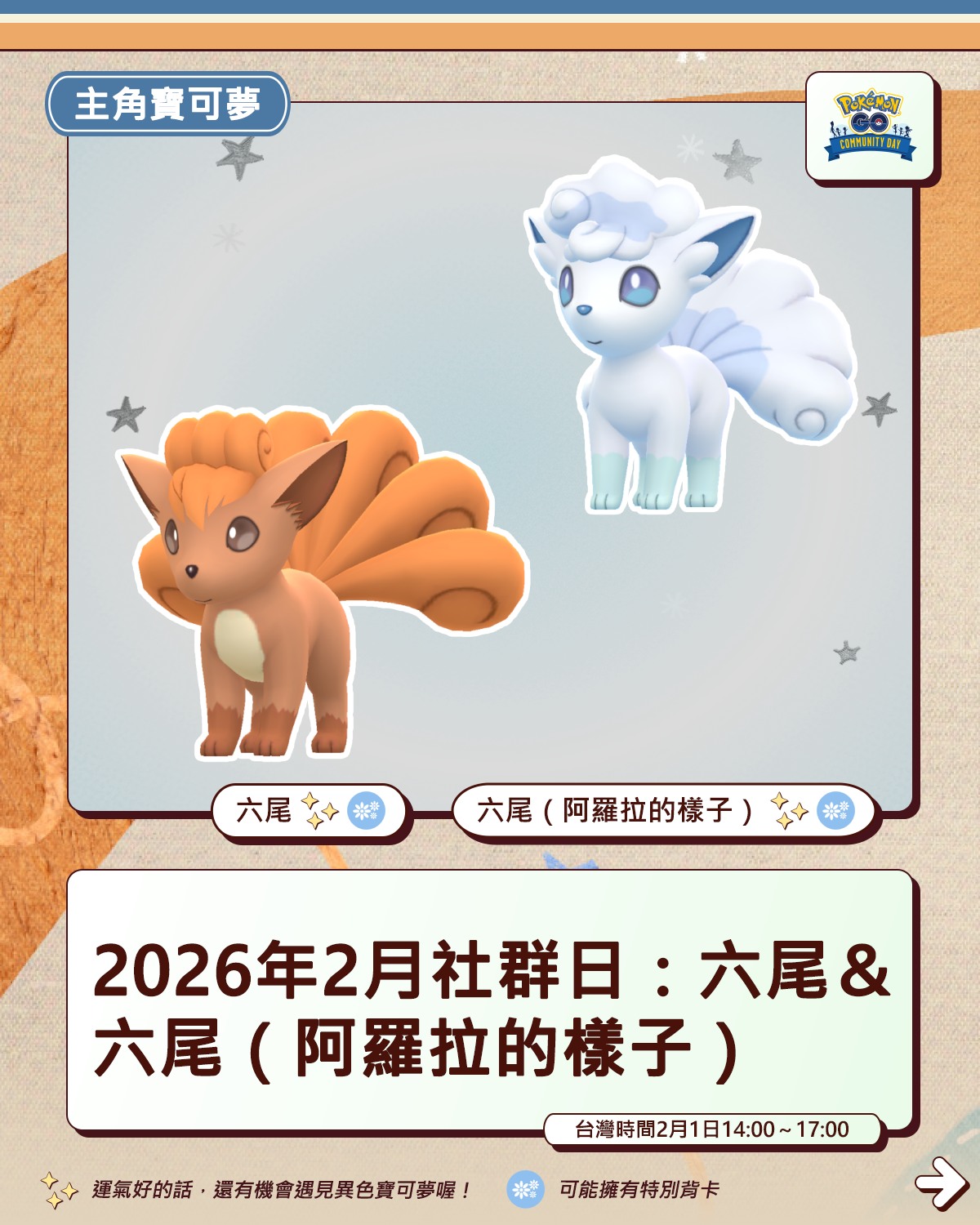 2026 年 2 月 《Pokémon GO》Vulpix(六尾)與阿羅拉六尾 社群日的活動指南。