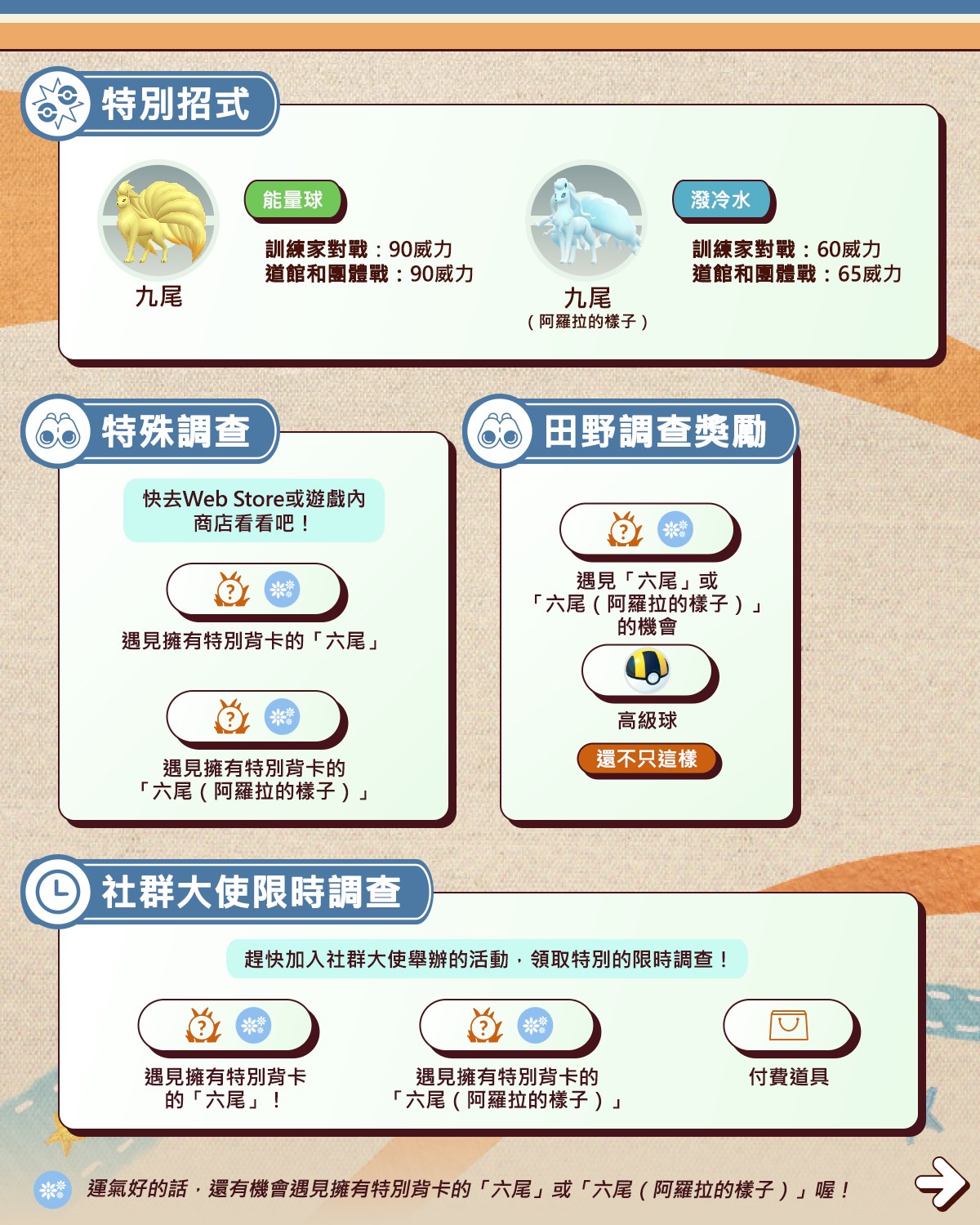 主角: 六尾(一般形態)與 阿羅拉六尾,異色(Shiny)出現機率增加。