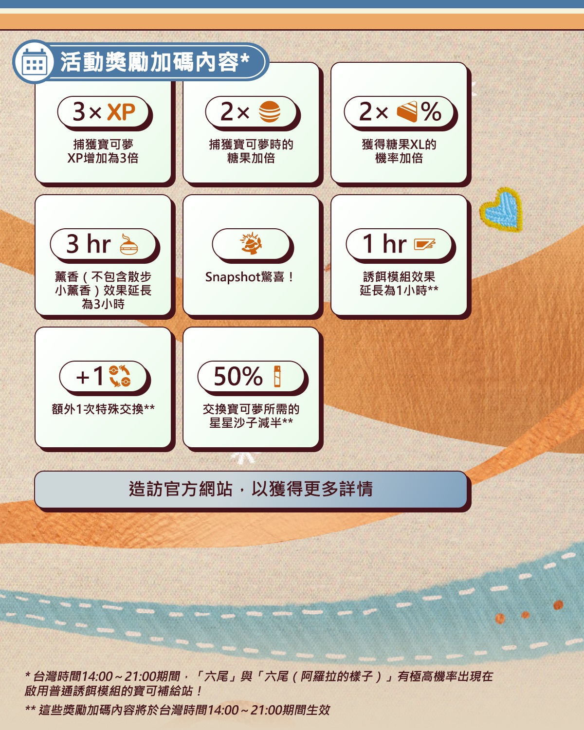台灣時間14:00~21:00期間,「六尾」與「六尾(阿羅拉的樣子)」有極高機率出現在啟用普通誘餌模組的寶可補給站。被誘餌模組吸引的「六尾」與「六尾(阿羅拉的樣子)」為異色寶可夢的機率仍會提高,且仍有機會擁有特別背卡。活動結束後,也有更多機會遇見主角寶可夢喔!