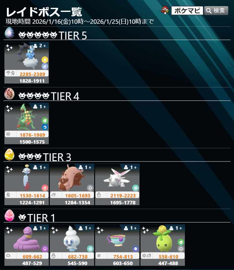 2026/01/16-2026/01/25 更新 BOSS 最新GO團體戰頭目CP表更新 1星-6星 頭目一覽 (Raid Boss List)