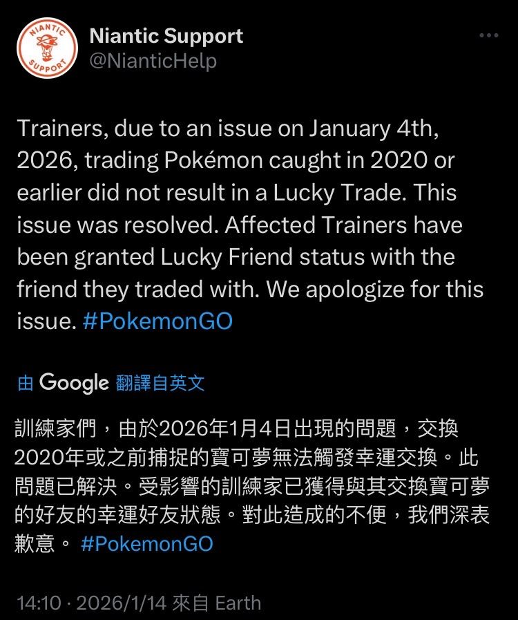 親愛的訓練家們,部分訓練家在 2026 年 1 月 4 日 交換於 2020 年或更早捕捉的寶可夢時,未能正常觸發亮晶晶交換,該問題已修正。