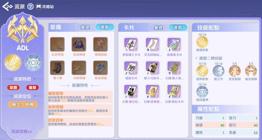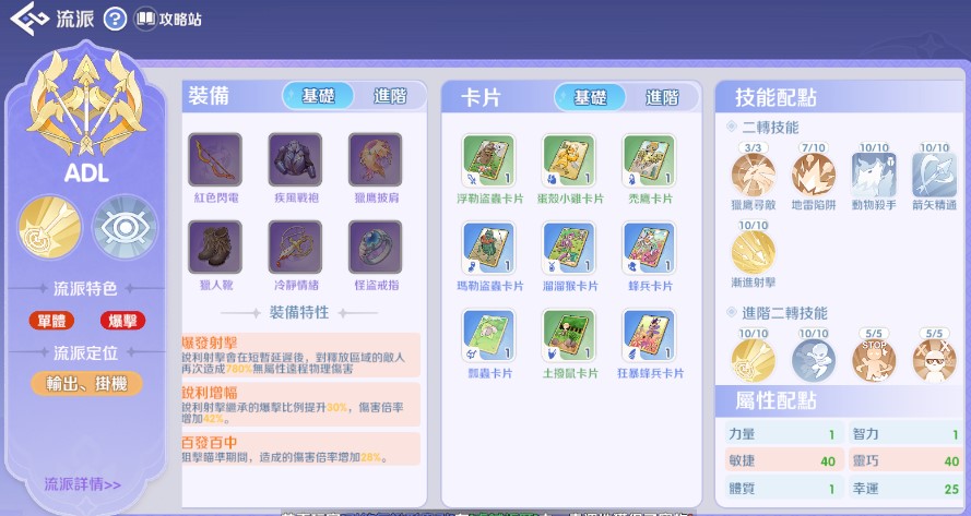 配點: 敏捷 (AGI) 為主 (撐攻速),幸運 (LUK) 為輔 (撐被動發動率)。