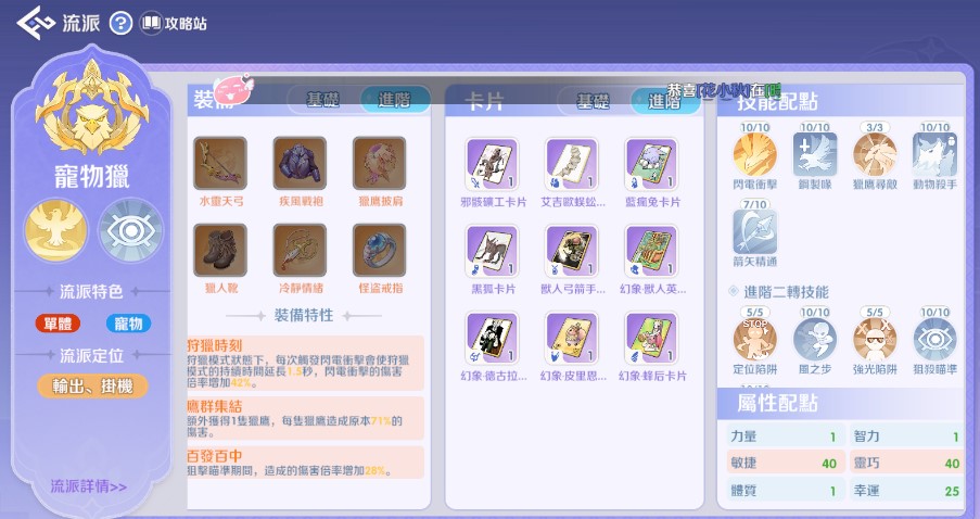 流派: 鳥獵 (寵物獵、Pet Build),依靠獵鷹自動攻擊與高攻速輸出。