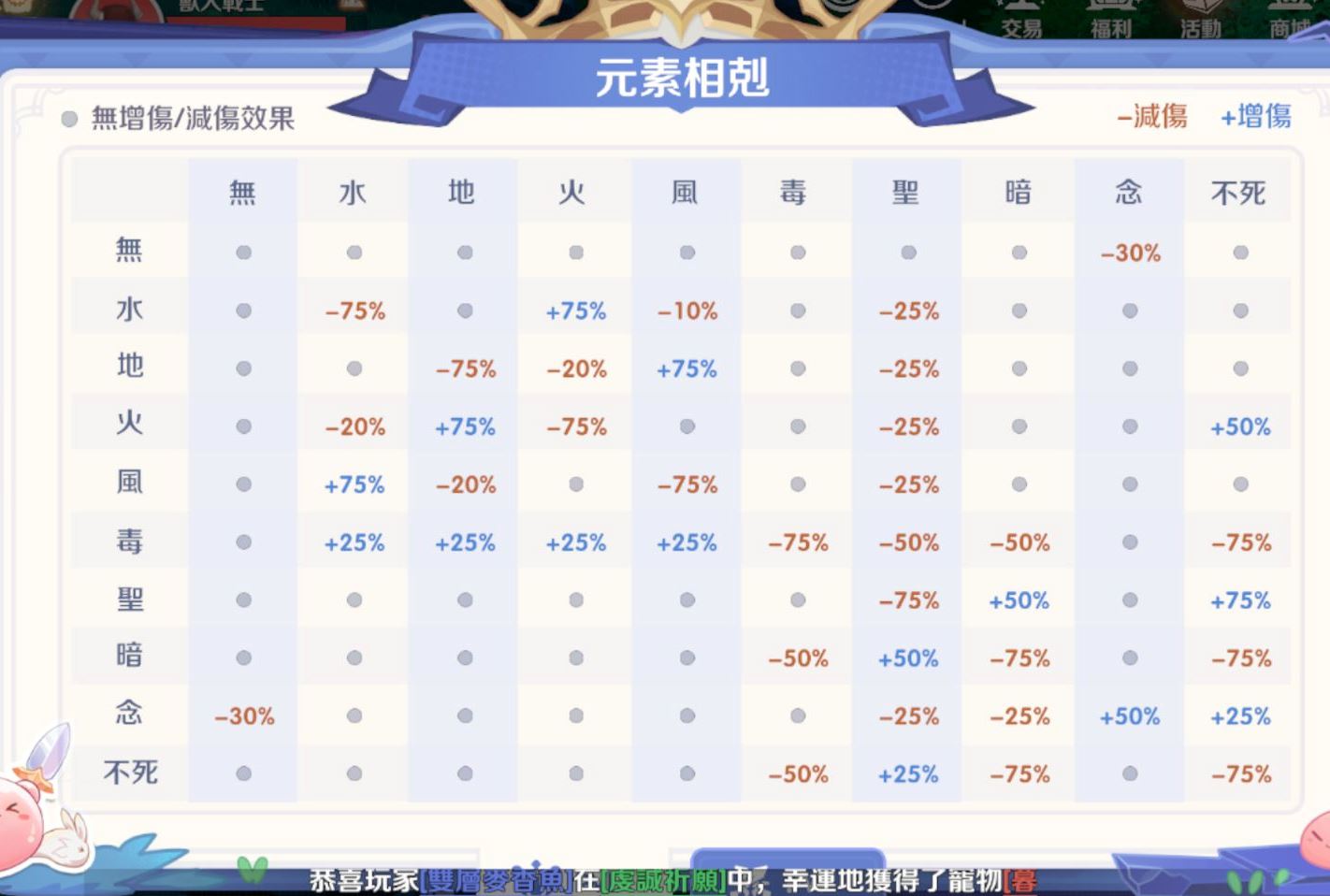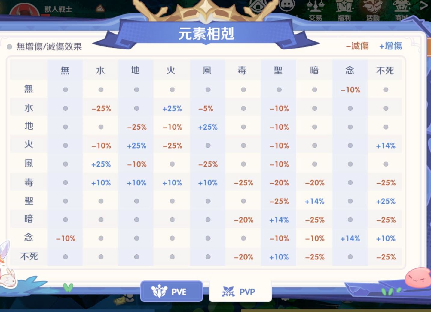 傷害倍率: PVE 的屬性剋制極強(四屬性互剋達 75%),而 PVP 被大幅壓縮至 25%。這意味著在打王時選對屬性非常關鍵,而在 PK 時屬性優勢雖然存在,但不會像打怪那樣直接決定勝負。