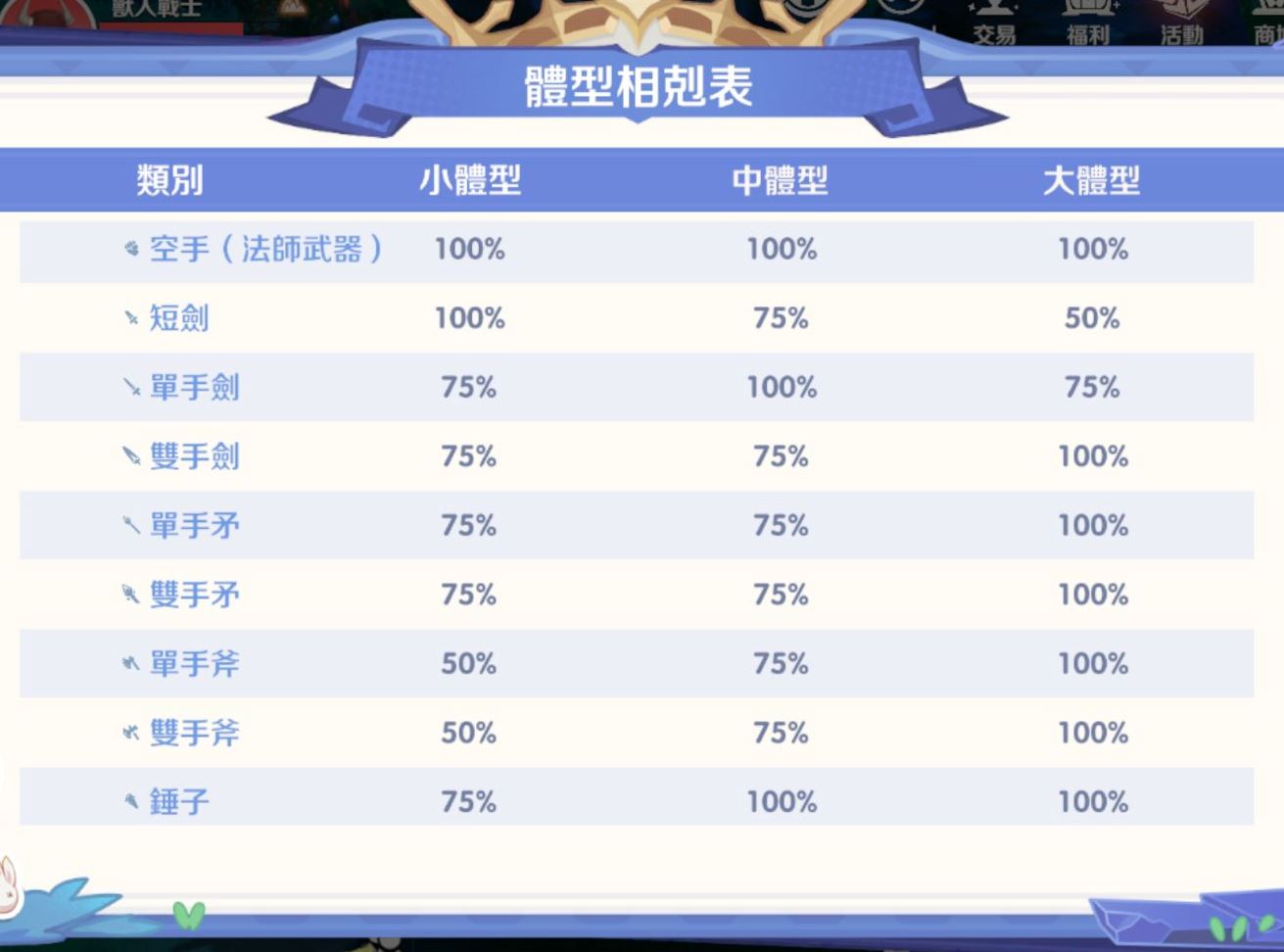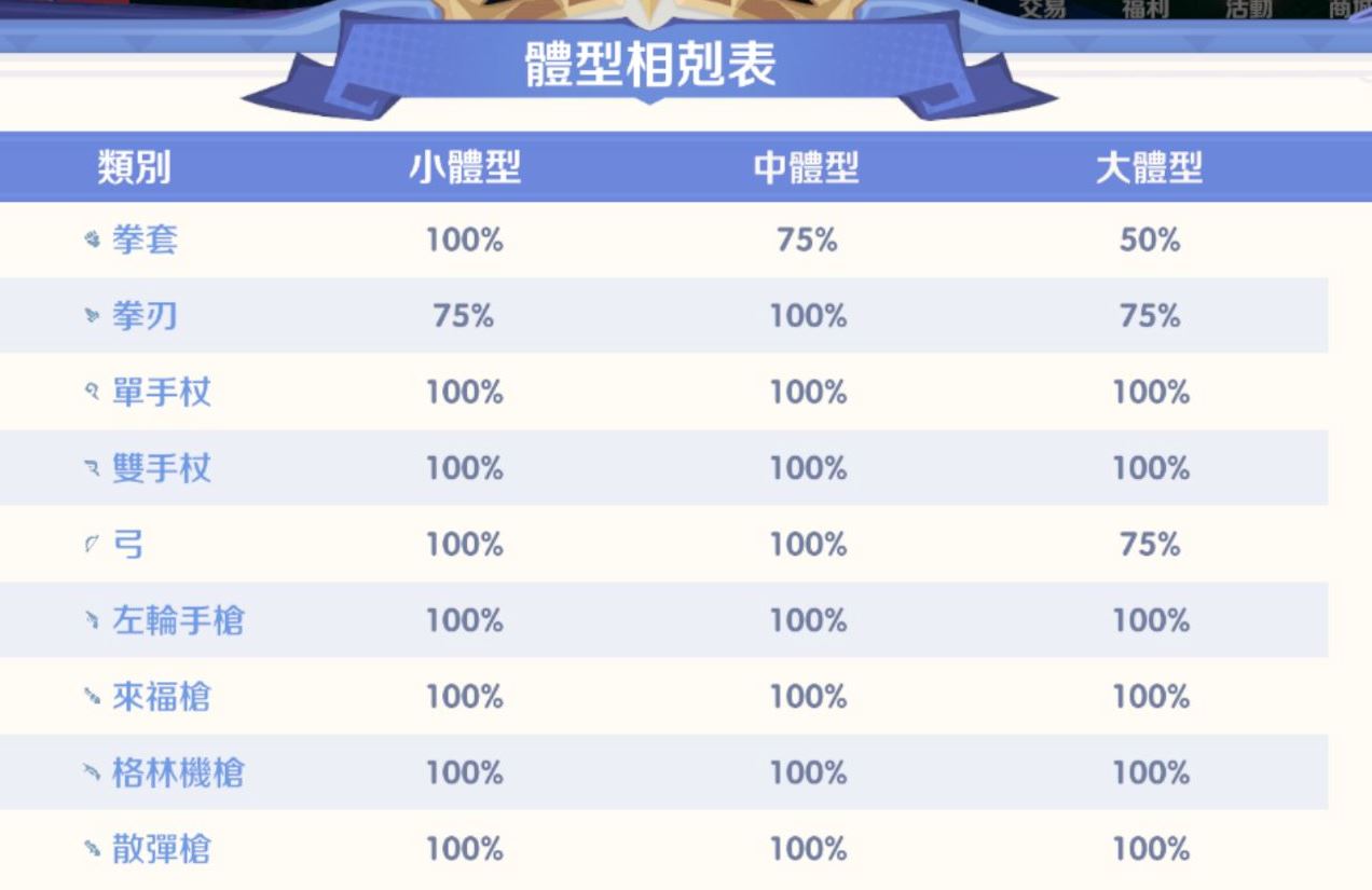 全體型通吃 (100%): 空手/法師武器、錘子 (僅對小體型75%除外)、各類法杖、以及大多數槍枝類武器。