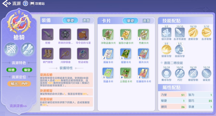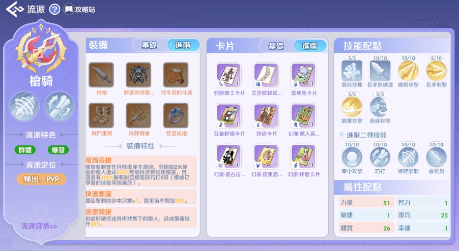 本流派(螺旋擊刺)適合「進階二轉」時期的騎士,主打低造價與成型快。