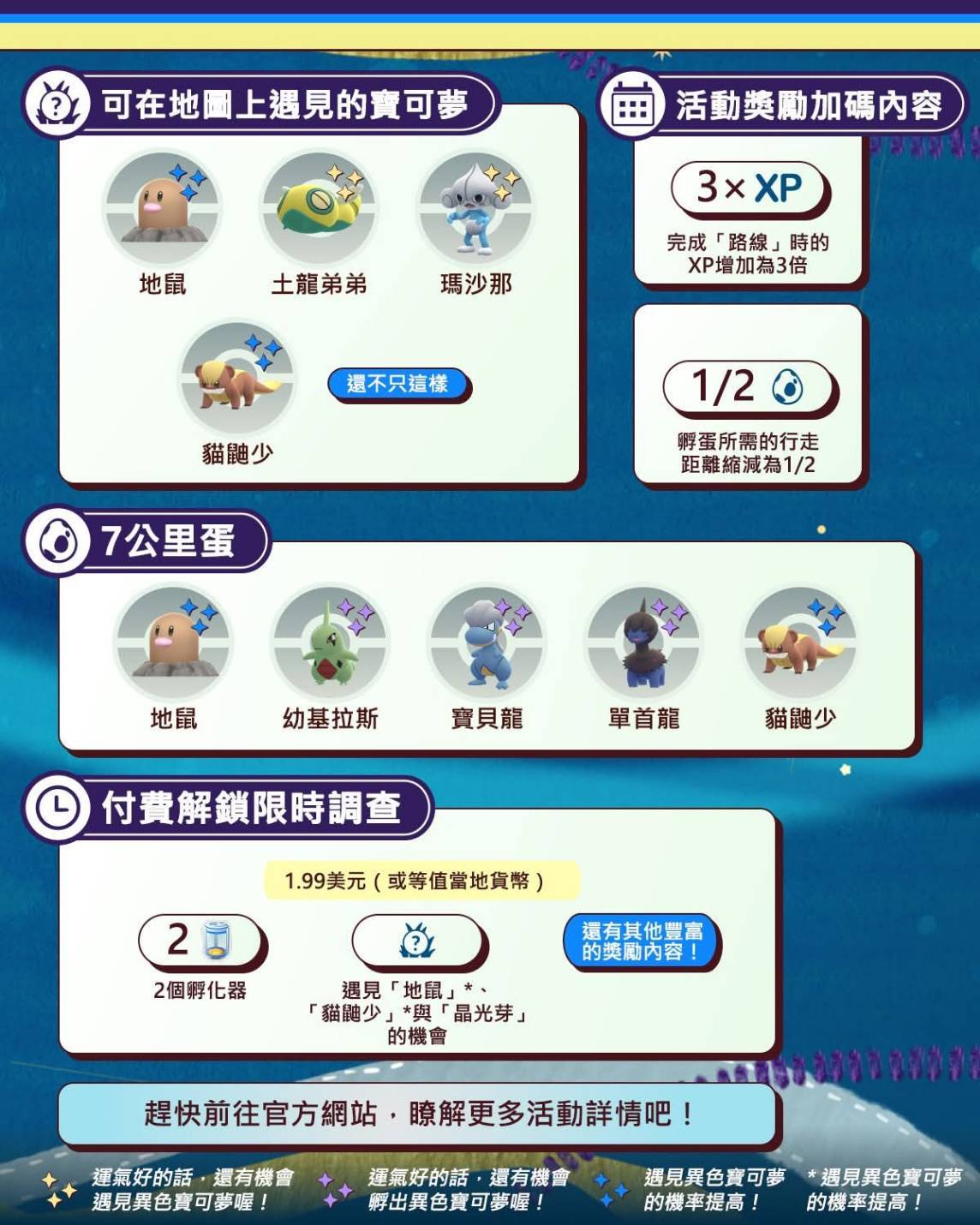 異色加倍: 確認活動期間 地鼠 與 貓鼬少 的異色機率將有顯著提升(Increased Shiny Odds)。