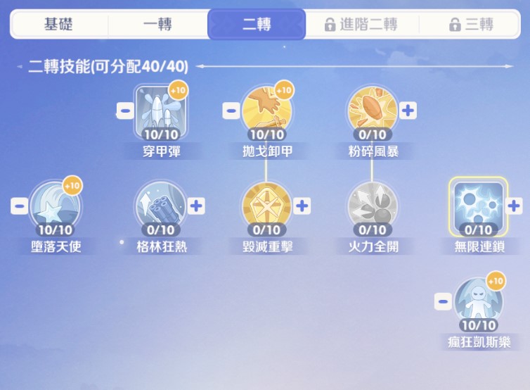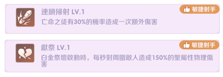 【定位】:單體、極致攻速、定點輸出、掛機首選 【特點】:攻速最快,開啟「格林狂熱」後變成移動砲台(走得慢射得快),非常適合長時間掛機打素材。