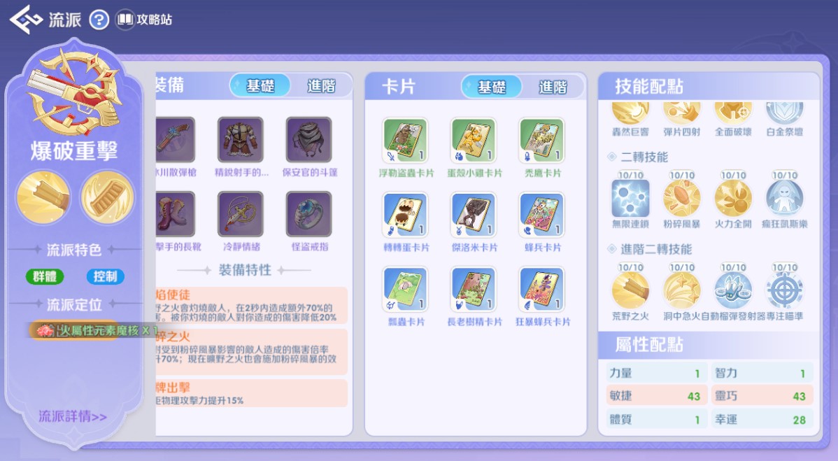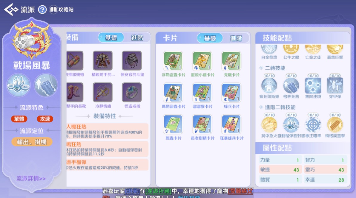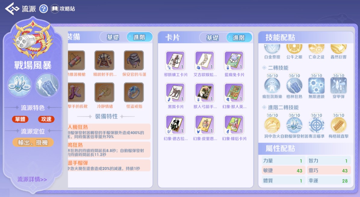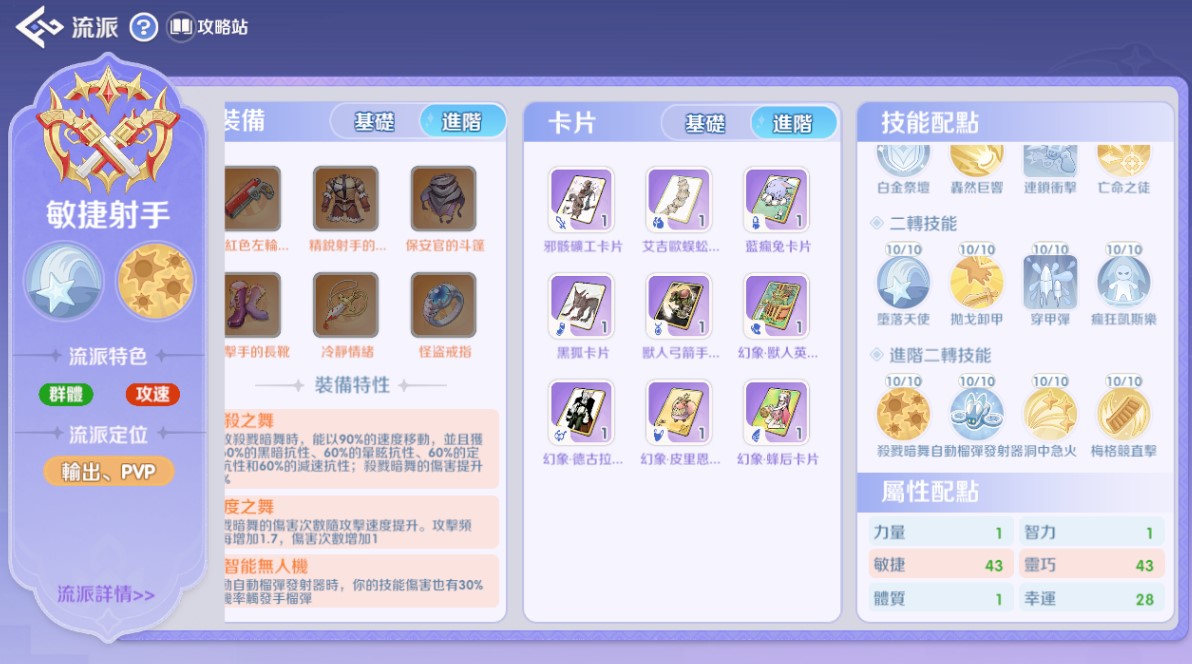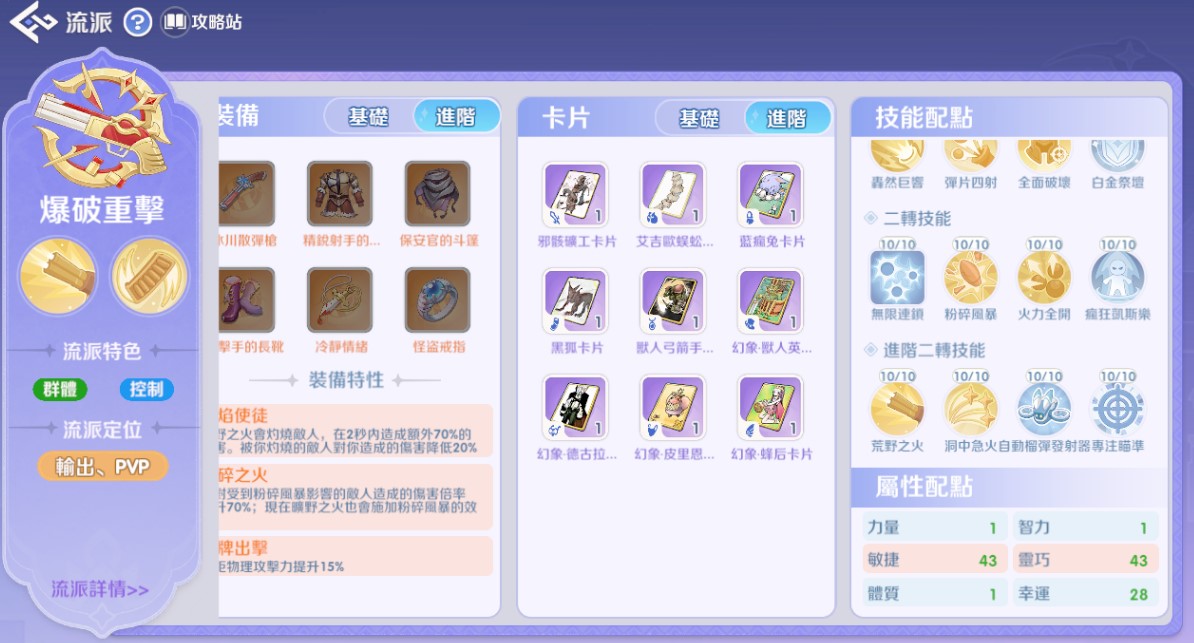 這四種流派分別對應四種不同的武器(手槍、來福槍、格林機槍、散彈槍),其定位差異非常大。以下為你詳細分析這四種流派的建議素質、技能、卡片及寵物推薦: