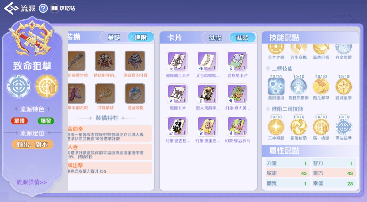 【定位】:單體、超遠射程、技能爆發、副本打王 【特點】:放棄攻速,追求「一擊必殺」。透過疊加瞄準層數,打出超高倍率的傷害,適合打MVP或副本BOSS。