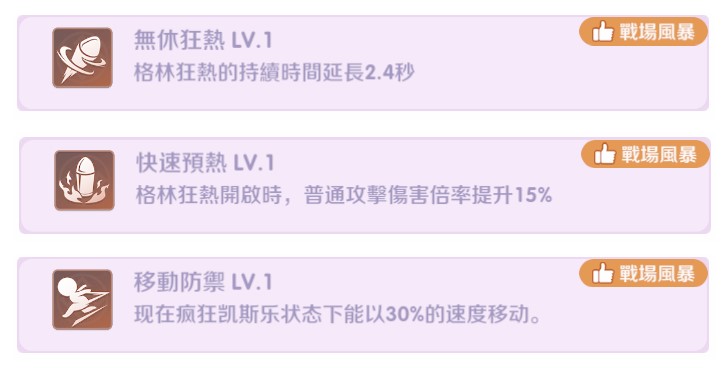 重點: 開啟「格林狂熱」後會降低移動速度,因此不適合需要頻繁走位的戰鬥,但在定點掛機時效率極高。