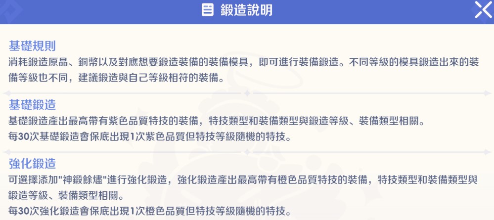 基礎鍛造 基礎鍛造產出最高帶有紫色品質特技的裝備,特技類型和裝備類型與鍛造等級、裝備類型相關。 每30次基礎鍛造會保底出現1次紫色品質但特技等級隨機的特技。