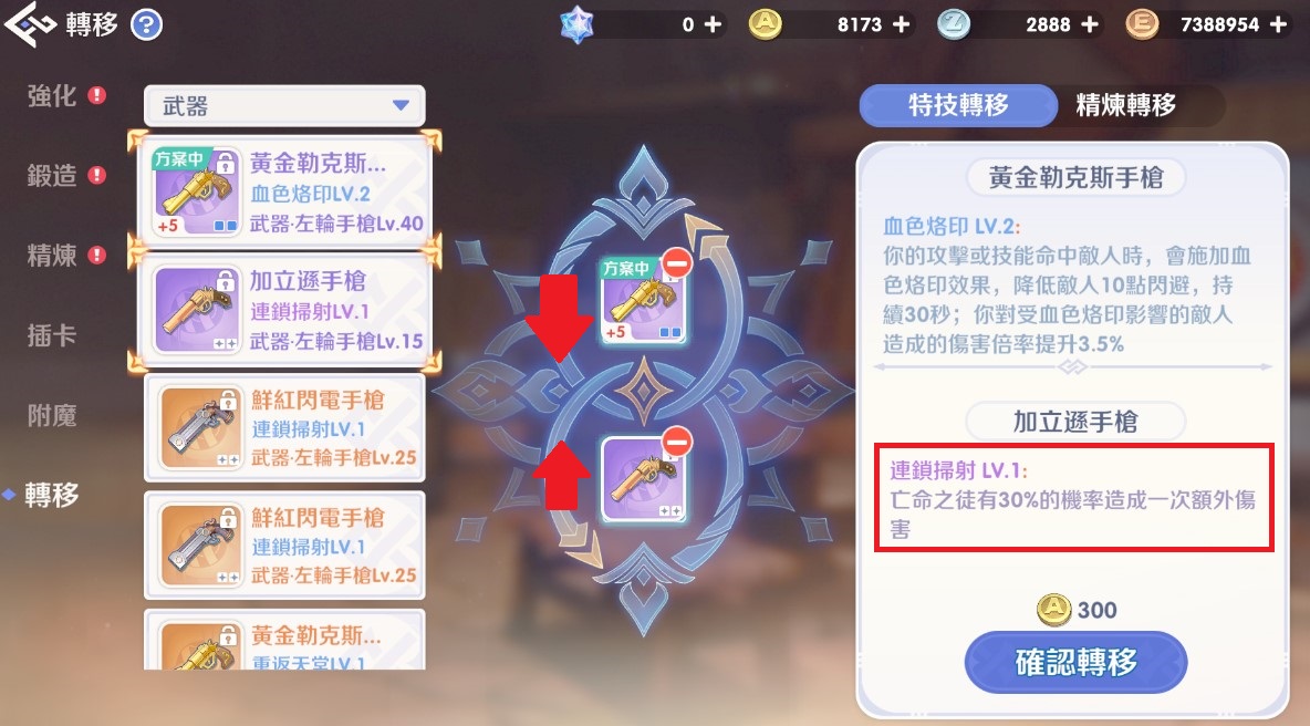 機制: 轉移後,兩件裝備的精煉等級互換。