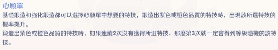 基礎鍛造和強化鍛造都可以選擇心願單中想要的特技,鍛造出紫色或橙色品質的特技時,出現該所選特技的機率提升。