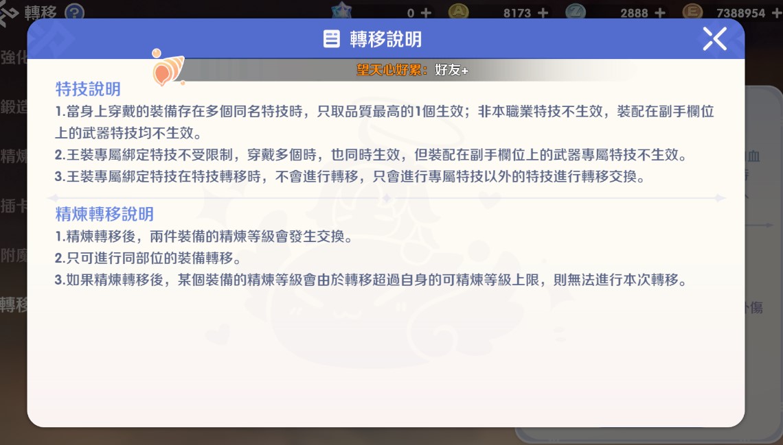 如果精煉轉移後,某個裝備的精煉等級會由於轉移超過自身的可精煉等級上限,則無法進行本次轉移。