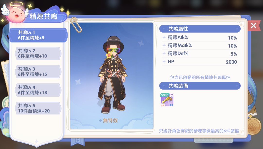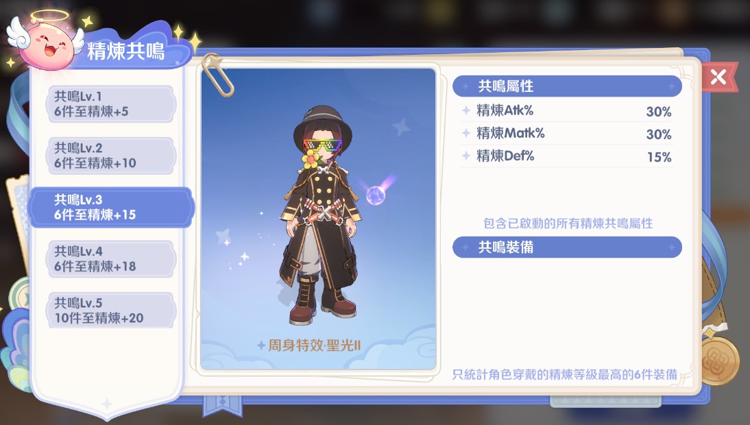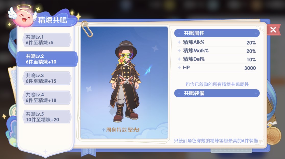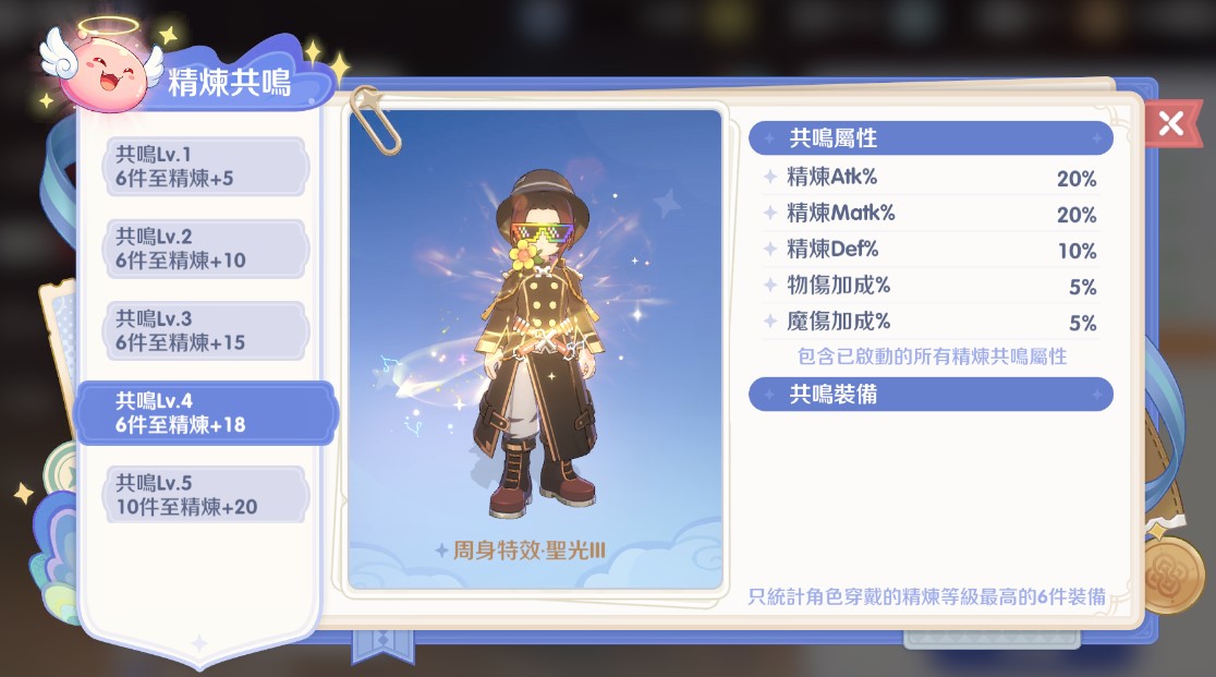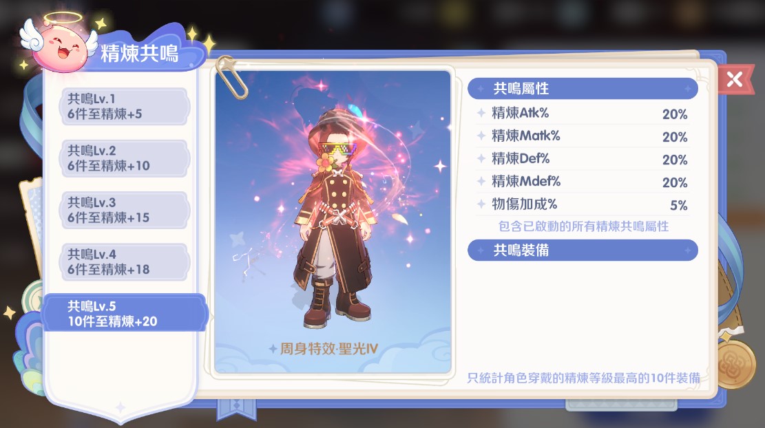 這是精煉的終極目標,提供大量的百分比屬性加成與外觀特效。 計算規則:只統計角色身上精煉等級最高的 6 件裝備。