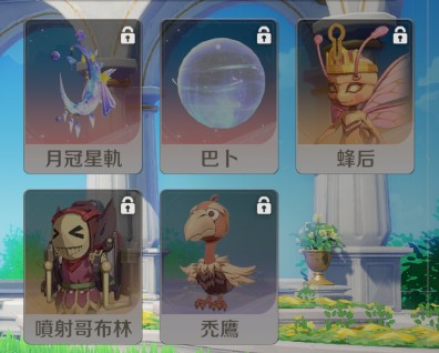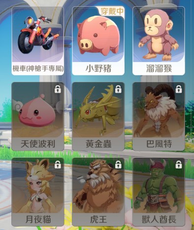 機車(神槍手專屬)、小野豬、溜溜猴、天使波利、黃金蟲、巴風特、月夜貓、虎王、獸人酋長、獸人英雄、