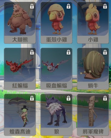 瘋兔、大腳熊、蛋殼小雞、小雞、紅蝙蝠、吸血蝙蝠、蝸牛、蝗蟲喬迪、