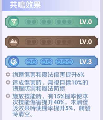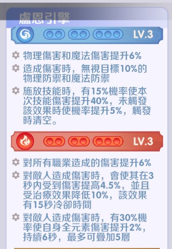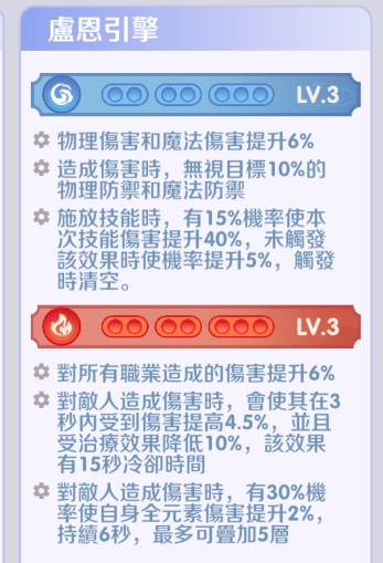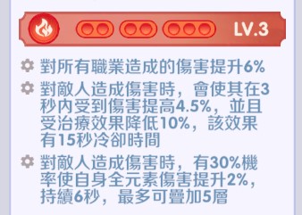 對敵人造成傷害時,有30%機率使自身全元素傷害提升2%,持續6秒,最多可疊加5層