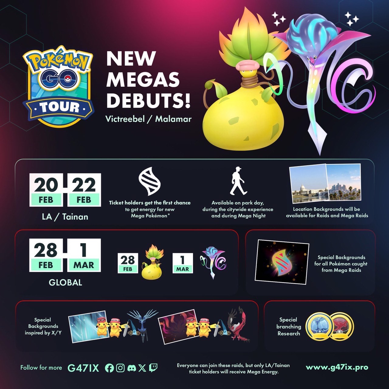 OJO: Los entrenadores sin entrada para el Pokémon GO Tour de Kalos en Tainan y Los Ángeles podrán participar en las incursiones de Mega Victreebel y Mega Malamar, pero no obtendrán Megaenergía de Victreebel ni de Malamar hasta el Pokémon GO Tour de Kalos – Global. 🦇✨
