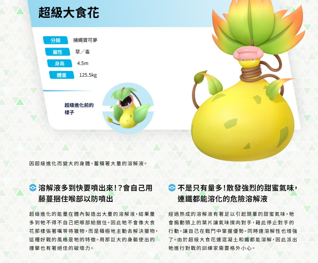 超級大食花:是給喜歡 PVE 刷傷害 或追求極致輸出的玩家。如果台南 GO Tour 登場,務必捕捉高 IV 的大食花(最好是淨化後的 100% IV,因為 Mega 不能用暗影)。