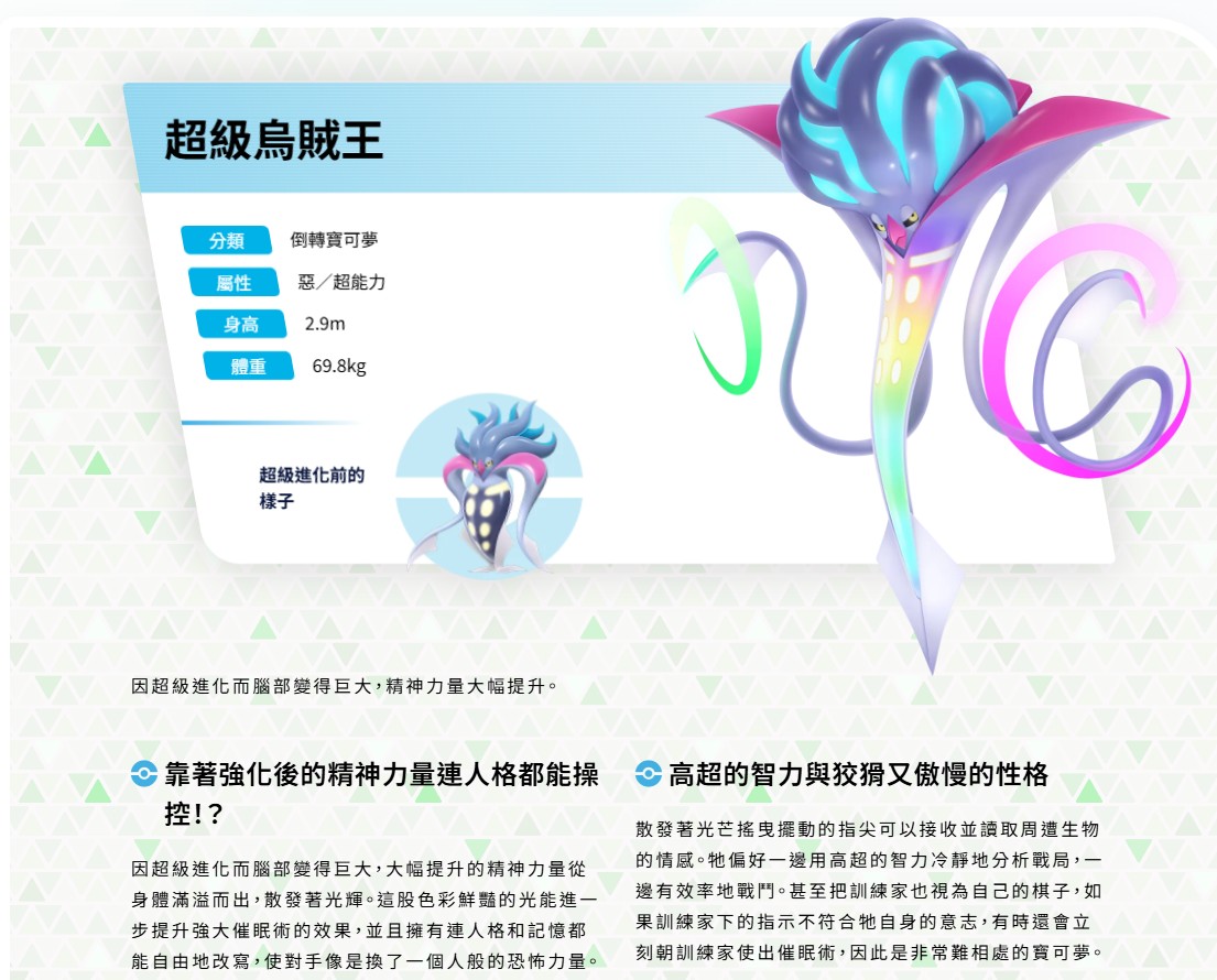 【基本體質預測】 烏賊王原本的三圍比較平均。超級進化後(設定上腦部巨大化、精神力增強),預計會大幅提升 防禦 (Defense) 或 體力 (HP),讓它變得非常坦。這對它在 PVP 的表現至關重要。