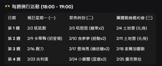 | 第 3 週 | 2/16 腕力 | 2/17 墨海馬 (傳送糖x2) | 2/18 索爾加雷歐 |