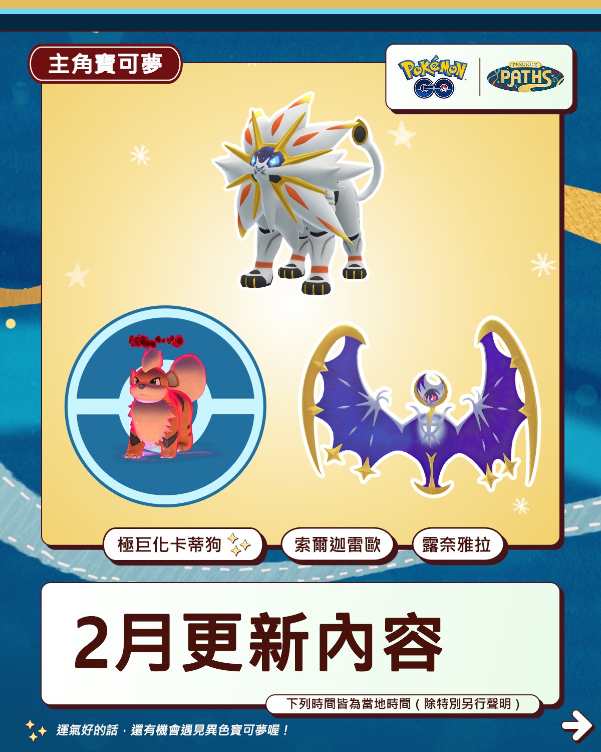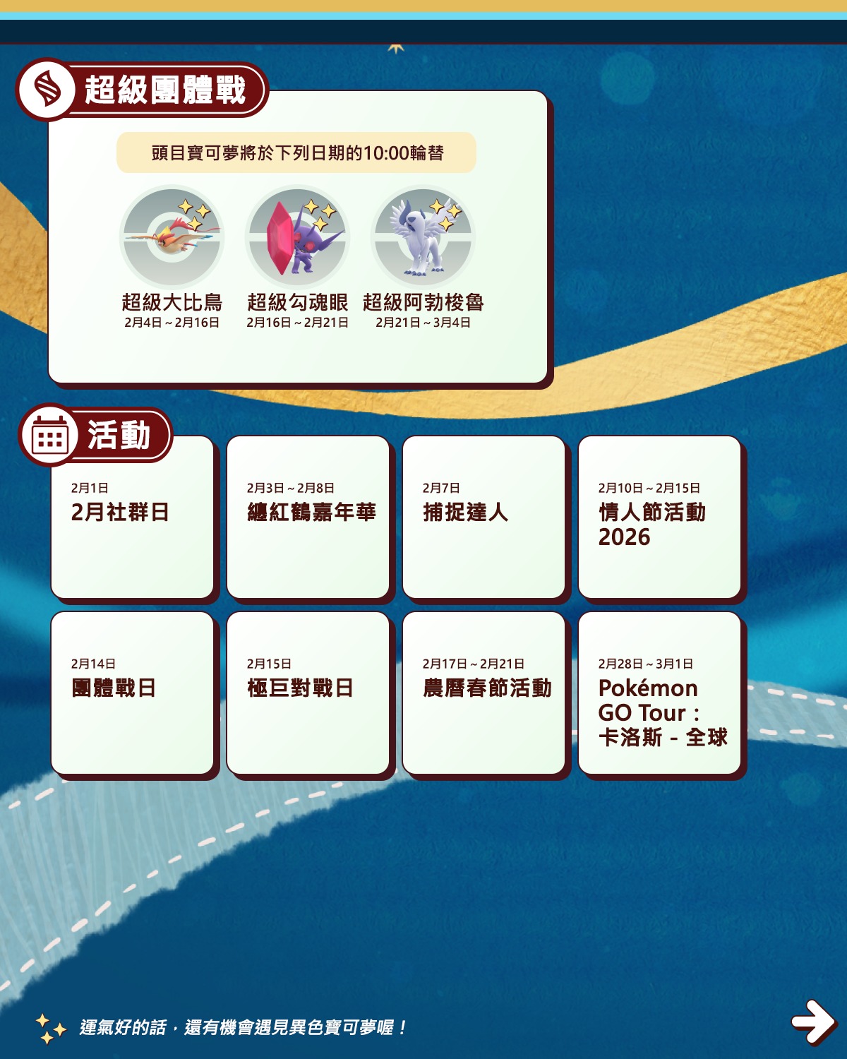 「纏紅鶴嘉年華」、「情人節活動」、「農曆春節活動」與「Pokémon GO Tour:全球」等活動即將在2月登場,你們準備好了迎接28天滿滿的活動了嗎?