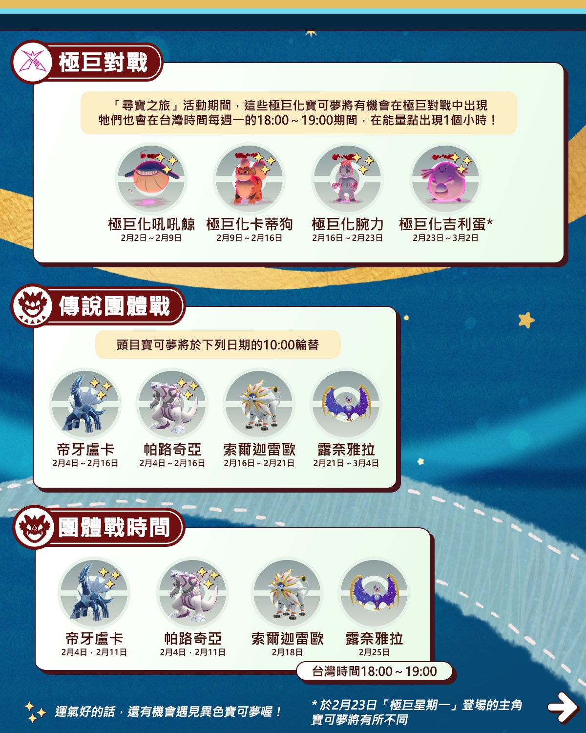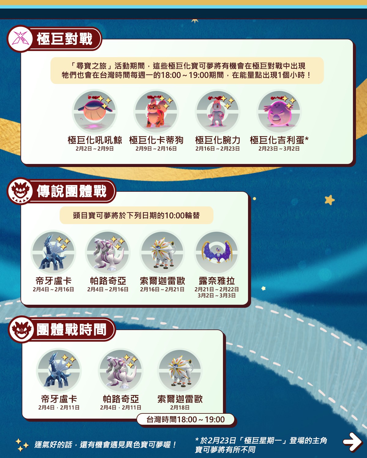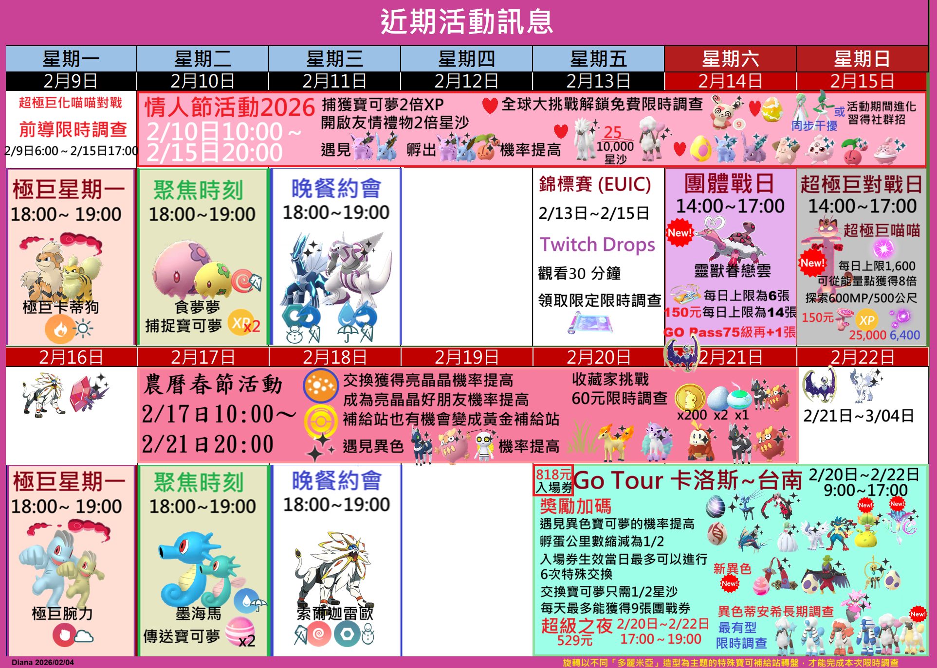 | 2/4 – 2/16 | 帕路奇亞 (起源形態) | 2280 / 2850 | 2/4 & 2/11 晚餐約會 | 🟡 |