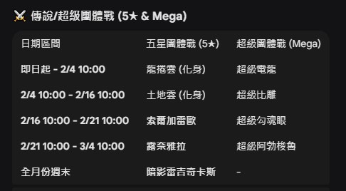 | 日期區間 | 五星團體戰 (5★) | 超級團體戰 (Mega) |