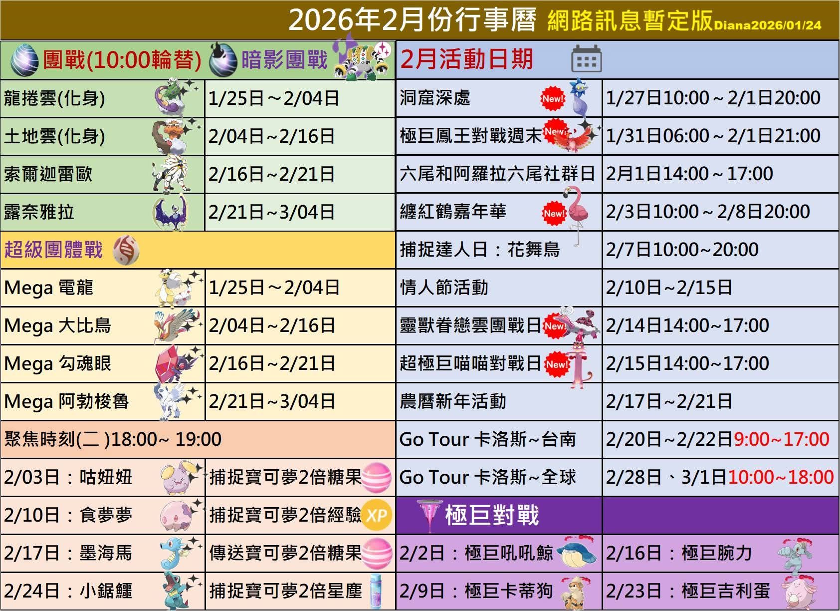 2026年 2月 Pokémon GO 活動行事曆簡表