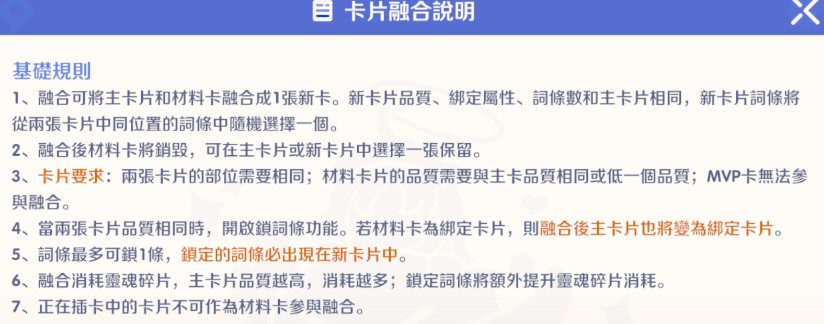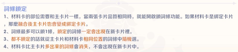 融合機制:可將主卡片和材料卡融合為 1 張新卡。新卡片的品質、綁定屬性、詞條數與主卡片相同。新卡片的詞條將從兩張卡片中「同位置」的詞條中隨機選擇一個。