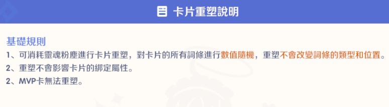 功能效果:消耗「靈魂粉塵」進行重塑,對卡片的所有詞條進行數值隨機。