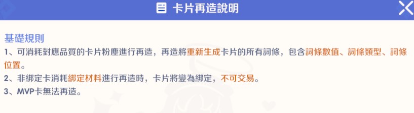 功能效果:消耗對應品質的「卡片粉塵」進行再造。再造將重新生成卡片的所有詞條,包含:詞條數值、詞條類型、詞條位置。