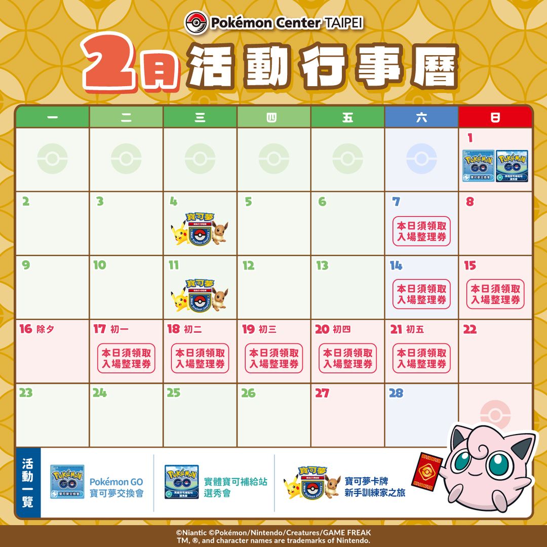 ※為了安全的營運並緩解擁擠狀況,Pokémon Center TAIPEI 將於以下日期發放「入店整理券」進行入場管理。詳細內容請參閱官方網站之說明。