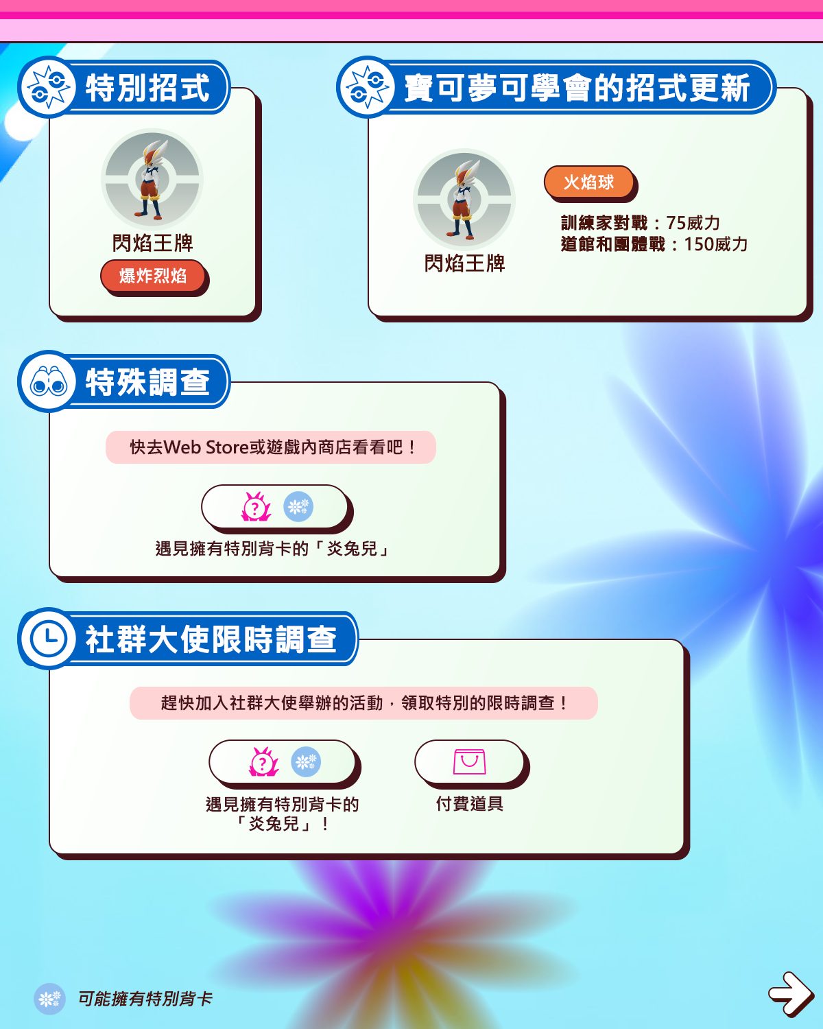 自本次活動起,「閃焰王牌」都能學會特殊招式「火焰球」了。