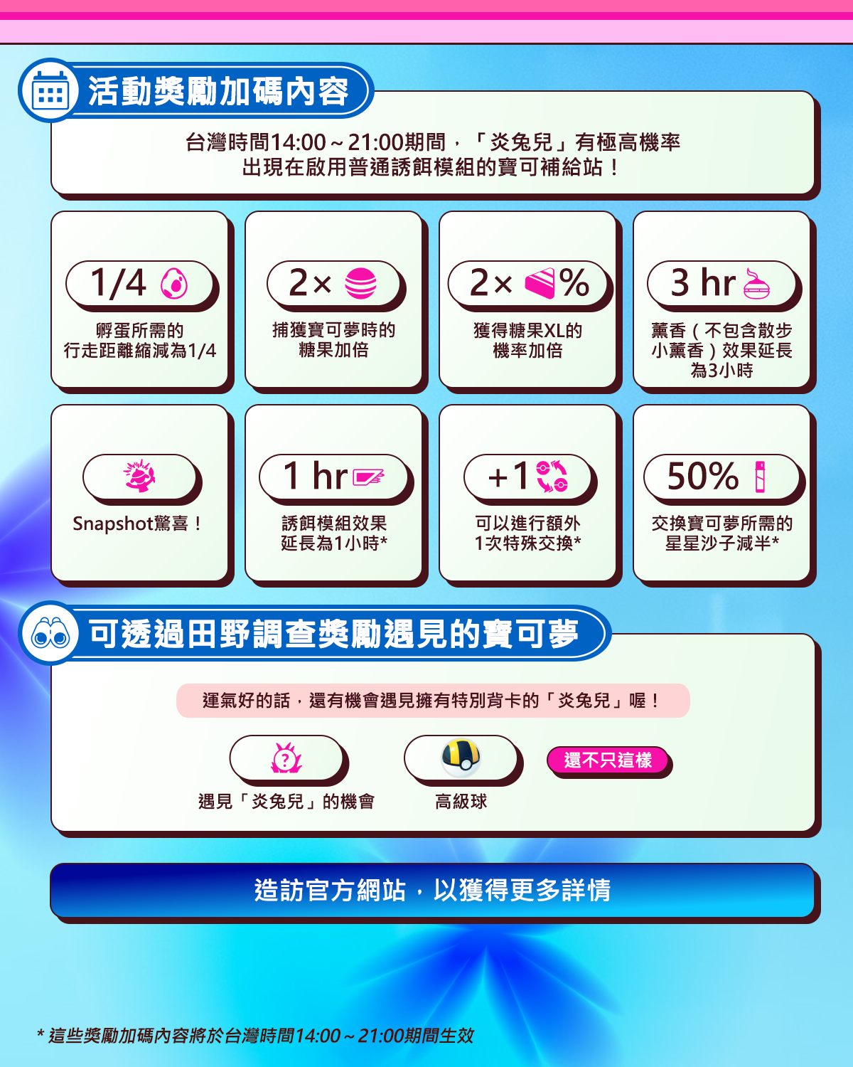 大部分獎勵僅限活動期間的3小時內生效,這些獎勵則會於台灣時間14:00~21:00期間生效。