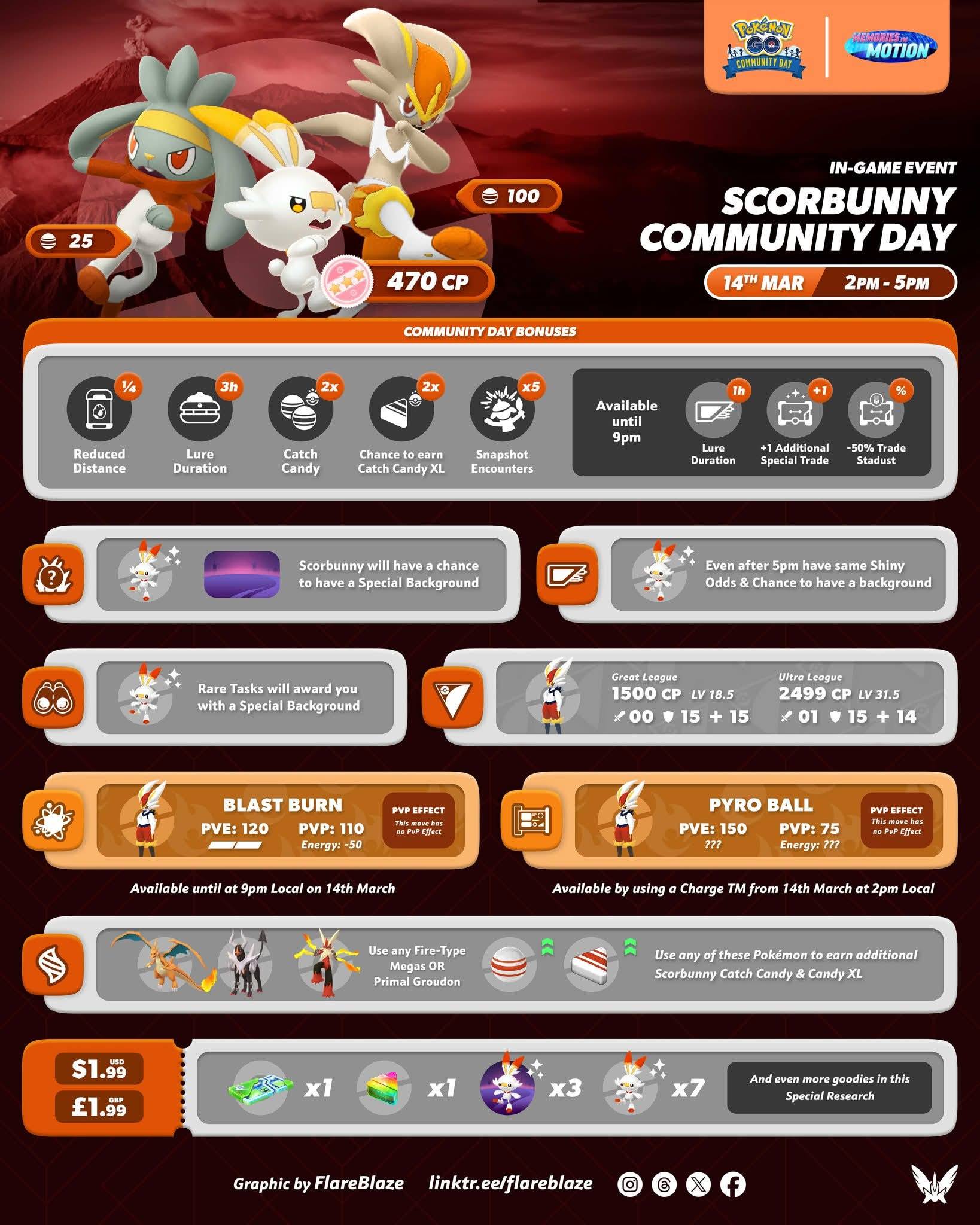 專屬招式: 針對 3/14 的社群日,後台已完成「爆炸烈焰 (Blast Burn)」與「火焰球 (Pyro Ball)」的數據配置。
