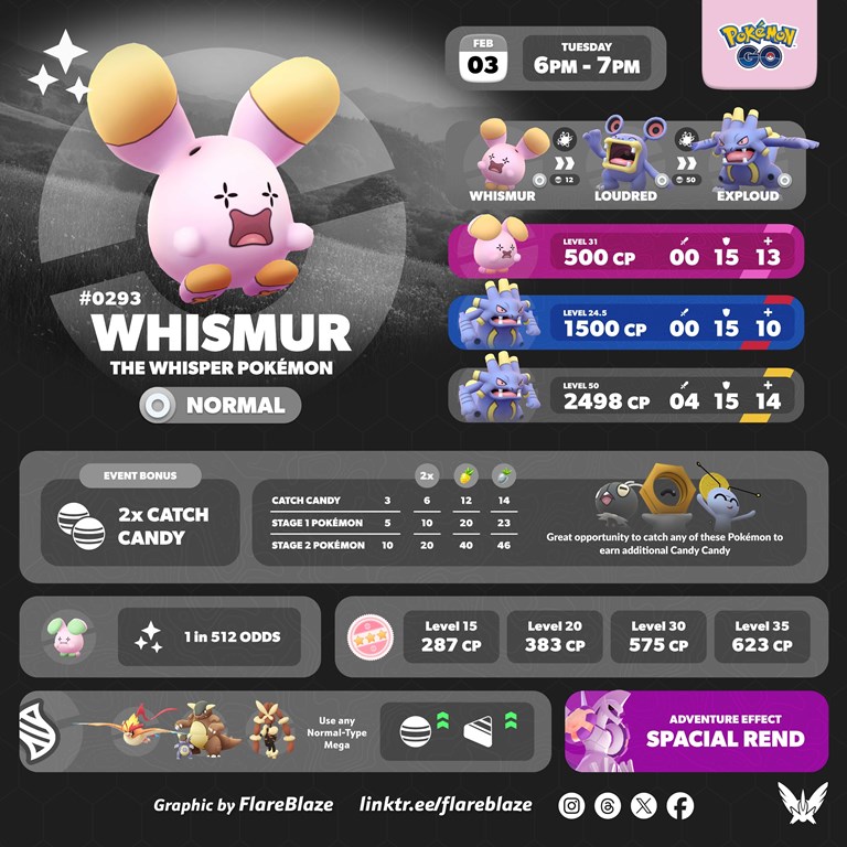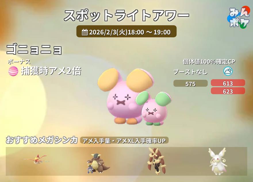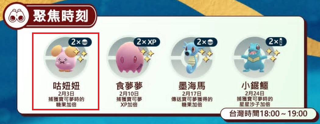 ● 02/03 週二聚焦時刻主角 : 咕妞妞 (Whismur) 大量出現,且擁有 2倍捕捉糖果 加成(有機率遇到異色 ✨)。