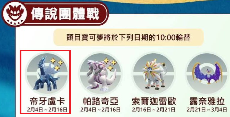 ● 02/04週三團體戰約會主角 : 帝牙盧卡、帕路奇亞 團體戰大量舉行