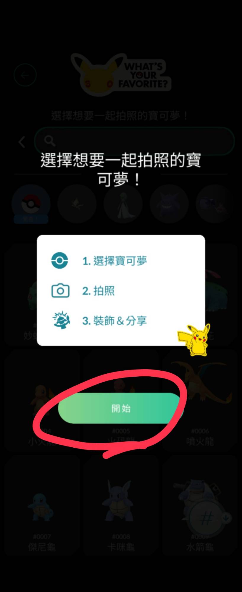 3.來到GO Snapshot畫面,點選中間皮卡丘或點右下「選擇寶可夢」。